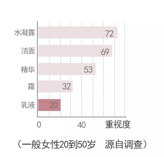 源自特意对各类护肤产品的重视度进行了调查,其中乳液被排在了最不被重视的位置,位于化妆水,洁面,精华之后的第四位。