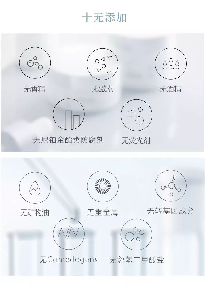 从创立之初就始终坚持不添加任何对人体和皮肤有害的物质,如含激素、抗生素、重金属等成分;不添加任何没有确切功效成分的物质;不添加任何纯度达不到要求,可能成为人体皮肤过敏源的物质;不添加任何会给皮肤造成负担或依赖的物质。